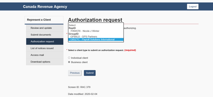 - Select the appropriate Group ID from the drop down list provided, and select Business Client. Then select Submit.