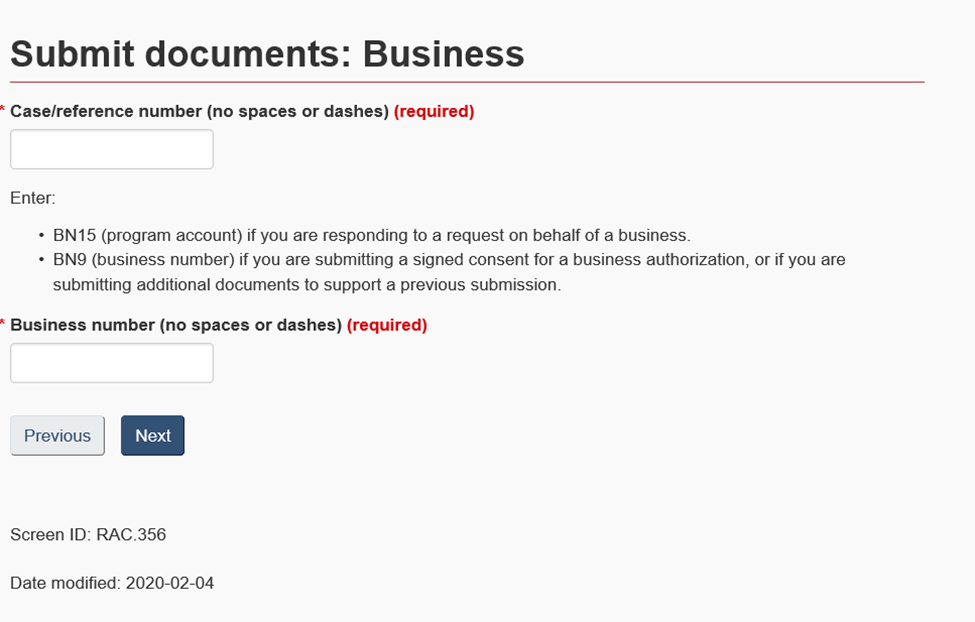 NOTE: Business consent forms are only valid for approximately 30 days from the date of request, therefore, it is imperative to ensure that the signed business consent and support documentation, as applicable, is provided back to CRA before the expiration of the request.