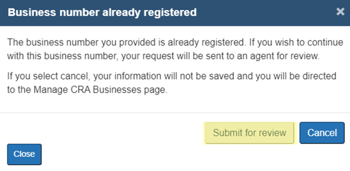 If the Client is registered for ROE Web, a pop up will appear stating the business number is already registered and to submit your request for review. Click Submit for review.