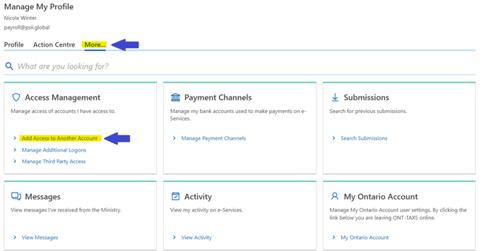This tab will provide the user with tools to manage the ONT-TAXS account, such as viewing submissions, messages from the Ministry, activity on the account, managing account access, etc.