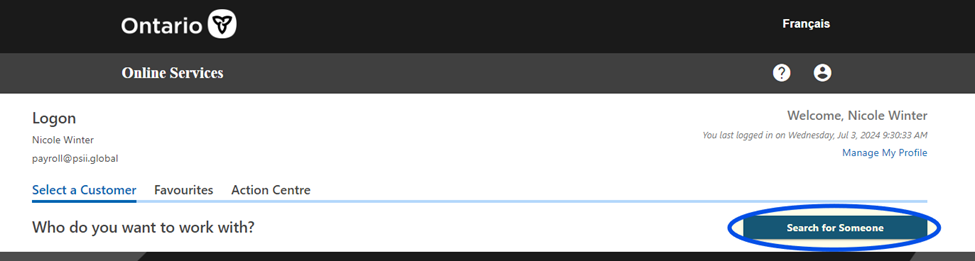 Once logged in, click on the "Search for Someone" button. This prompts you to the company tax accounts.