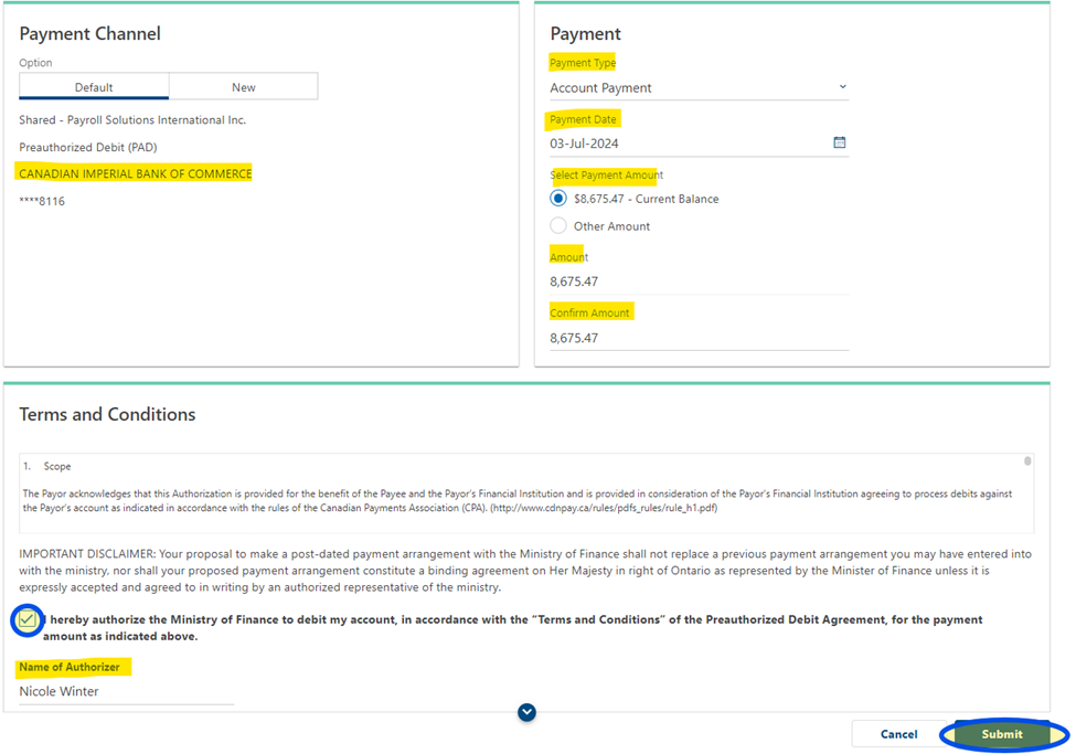Under the Terms and Conditions section, check the box that you acknowledge the T&C and authorize the Ministry of Finance to debit the account selected under the Payment Channel. Enter your name as the authorizer. Then click the “Submit” button to proceed.
