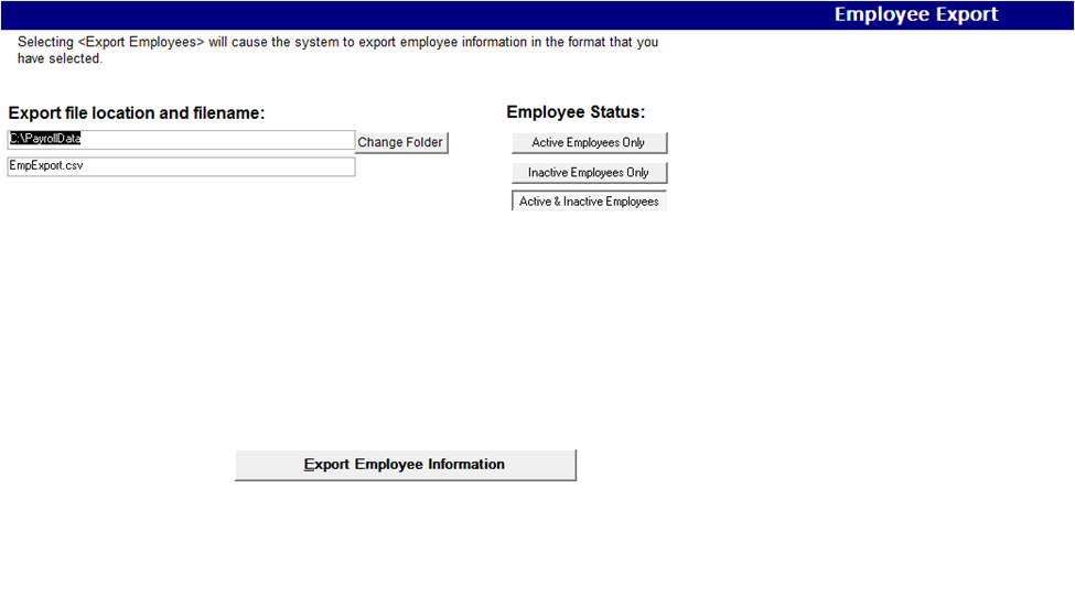 - Select Active & Inactive Employees. This will ensure all active and inactive employees are included in the export file so that the Client can retain this information for their historical records