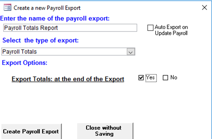 - Enter the name of the payroll export: enter the file name for the export (ie; Payroll Totals Report)