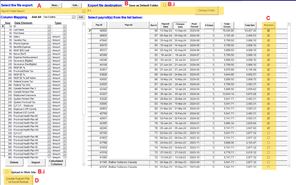 - Under the header Select payroll(s) from the list below section, tick the box under the Process column for each payroll that should be included in your export