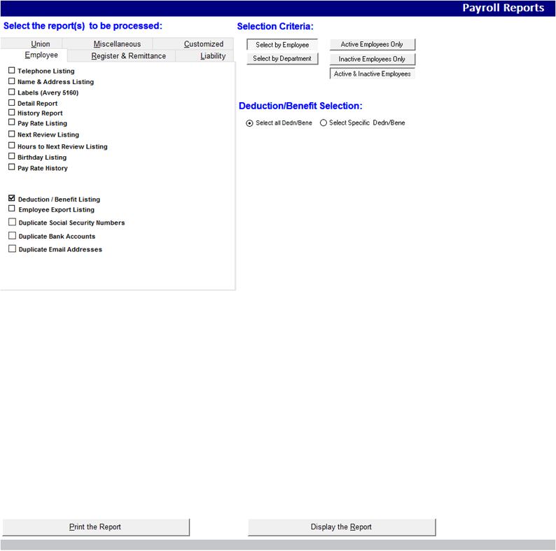 - Select Specific Dedn/Ben this option will allow you to create reports specifically for the deductions and benefits selected.