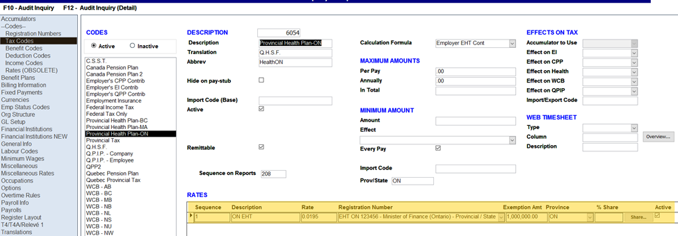 For example, select the Provincial Health Plan-ON tax code. The rate and exemption will be displayed under the Rates section