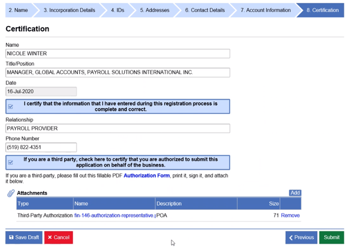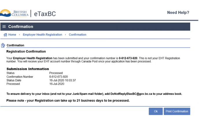 Once you click "Submit" a confirmation page will appear. Save a copy into the Client's Taxation Authorities folder.
