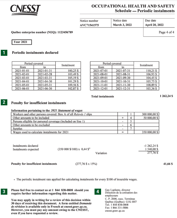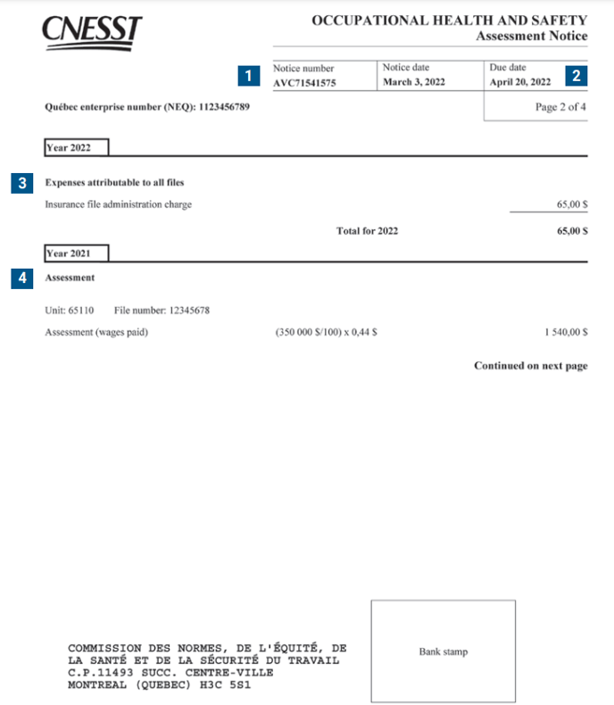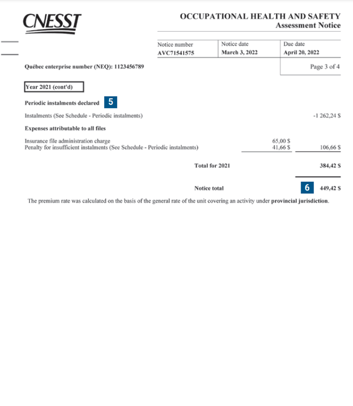 The CNESST sends employers the Statement of Account and Assessment Notice with regard to Québec’s Occupational Health and Safety Plan at least once a year. The Statement of Account lists all transactions relative to your insurance premium payments. The Assessment Notice indicates the insurance premium amounts that are payable, as determined by the CNESST.
