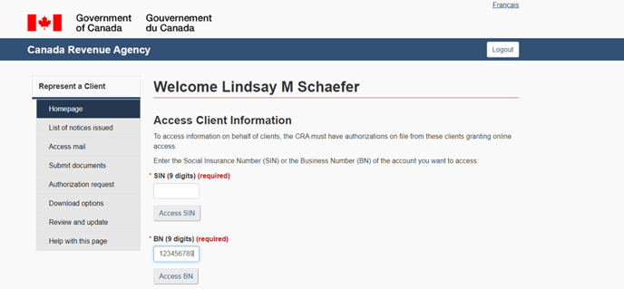 Once logged in, you are directed to the client access page. Enter the client’s 9 digit business number and click Access BN.