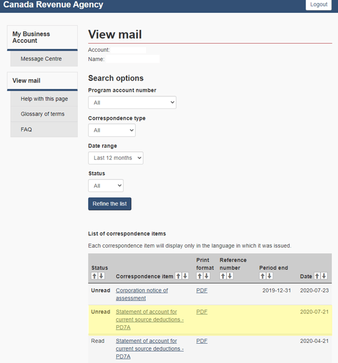 All mail corresponding to the client’s CRA accounts will appear.