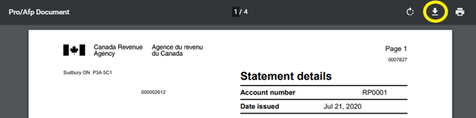 The statement of account document will be labelled as Statement of Accounts for Current Source Deductions – PD7A. Click on the PDF link beside the statement of account, the document will download at the bottom bar of the webpage.