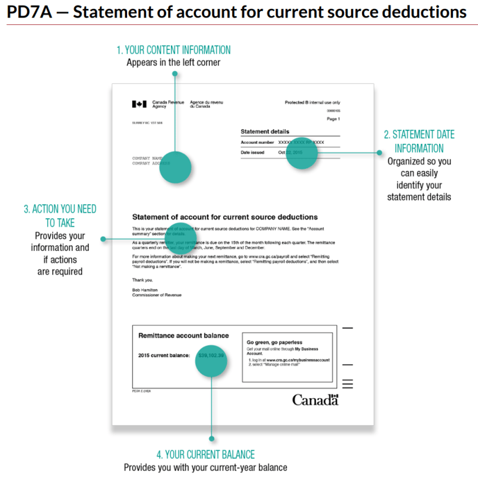 The PD7A includes information about the current account balances related to payroll deductions. This helps employers track their financial obligations to the CRA and ensures that they are meeting their payment requirements.